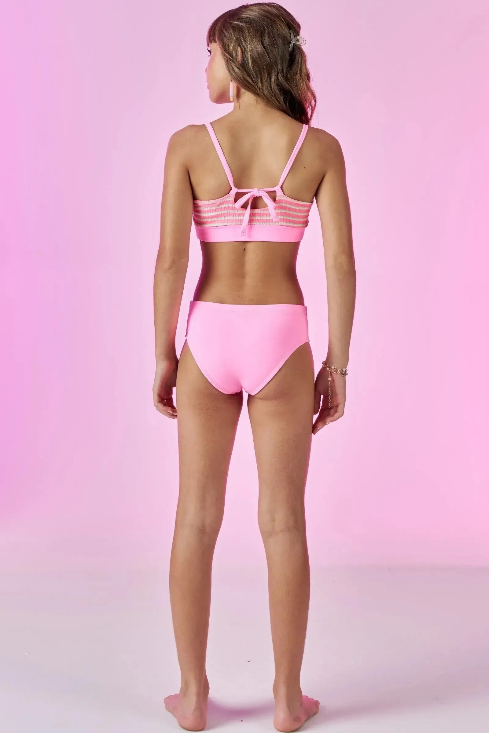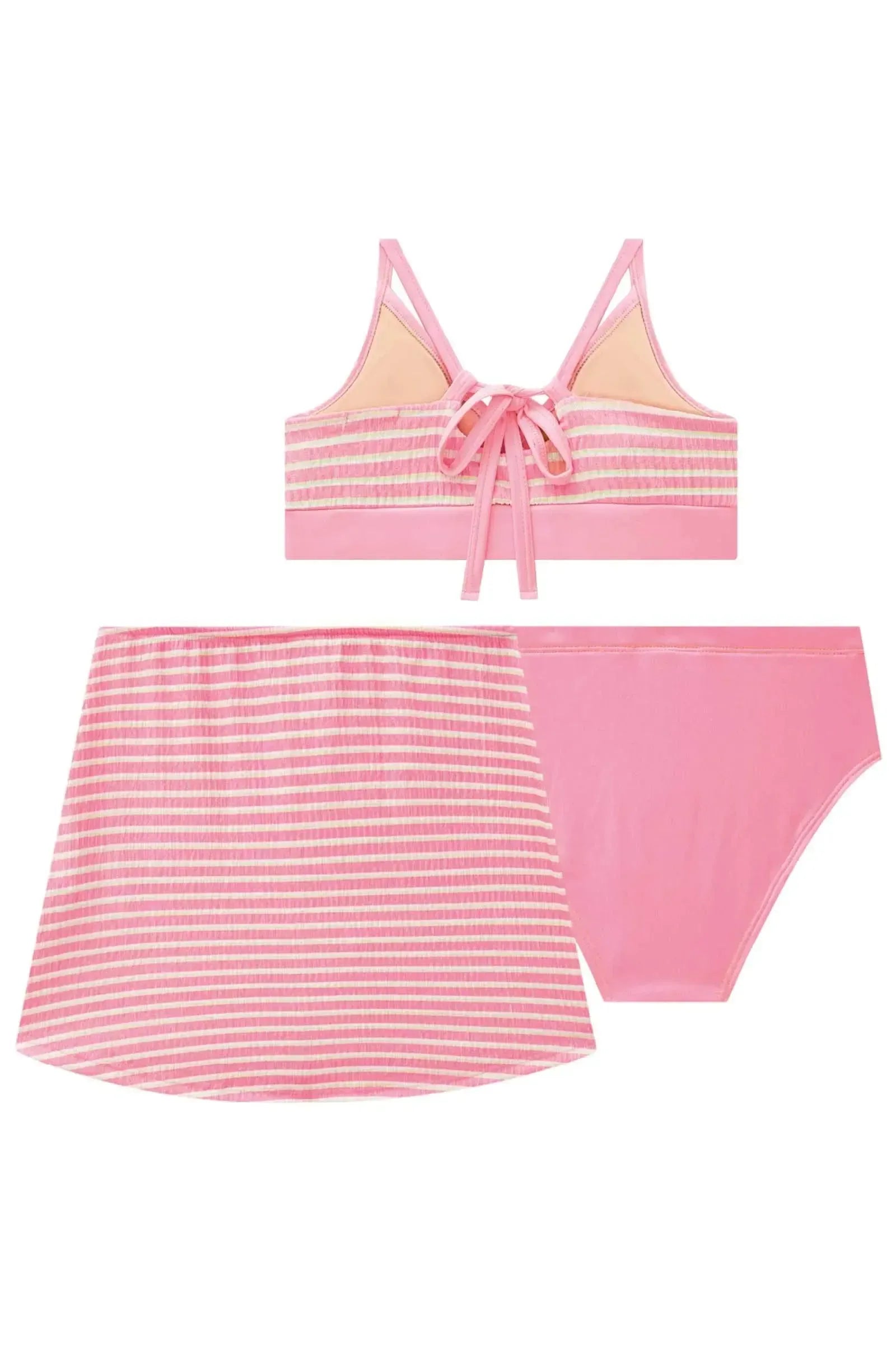 O trio de biquíni tradicional em malha UV50+ e saia em malha texturizada, é perfeito para as meninas que amam um look cheio de estilo e conforto para aproveitar muito o verão! Disponível em uma cor super estilosa - rosa - ele oferece um toque super macio e confortável, garantindo proteção para a pele das meninas.