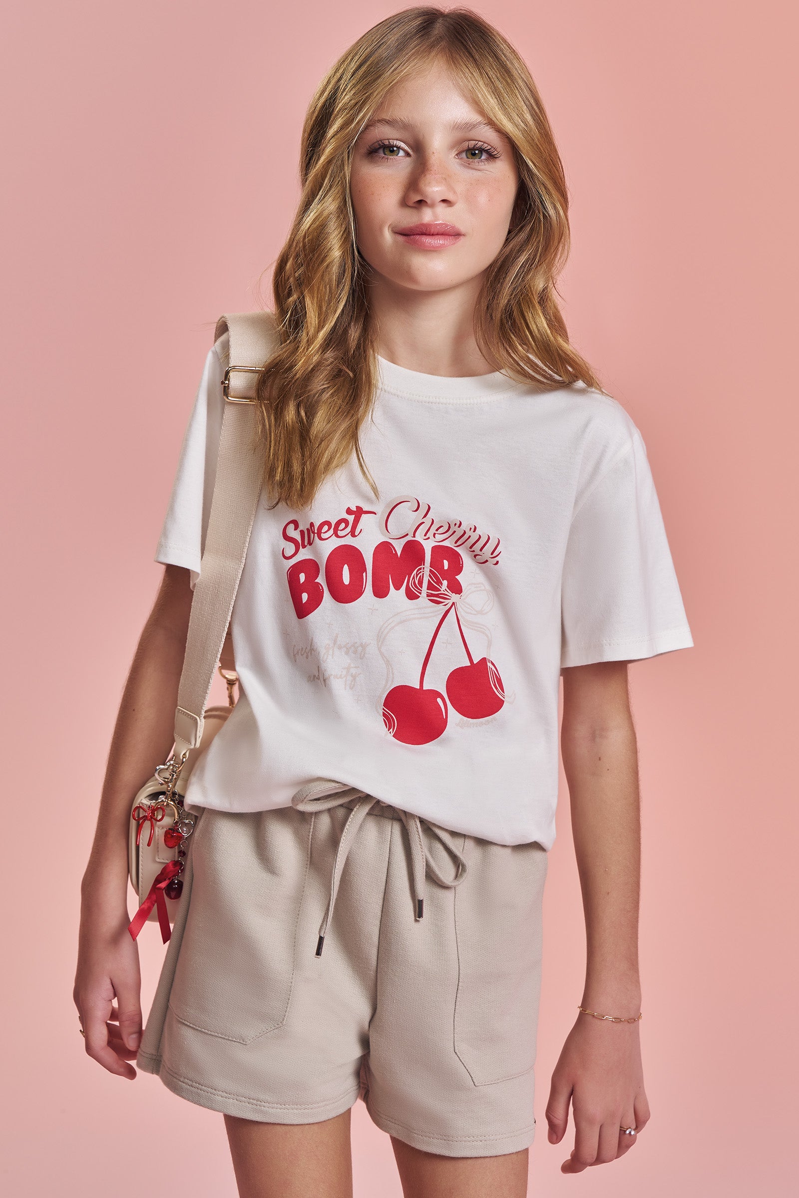 Conjunto Infantil Feminino Lilimoon - Blusa Comfy em Meia Malha e Shorts em Moletom sem Pelúcia O conjunto Lilimoon é perfeito para meninas que amam conforto sem abrir mão de estilo! Composto por blusa em meia malha leve e macia e shorts em moletom sem pelúcia, o modelo traz o equilíbrio ideal entre praticidade e moda casual. A blusa off-white possui estampa divertida de cerejas com lettering que adiciona um toque moderno e descontraído ao visual. O shorts em tom neutro completa o look com cós elástico, cadarço funcional e bolsos frontais, garantindo liberdade de movimento e conforto durante todo o dia. Ideal para o dia a dia, passeios e momentos de lazer, o conjunto é uma ótima opção para meninas que gostam de se vestir com estilo e leveza!