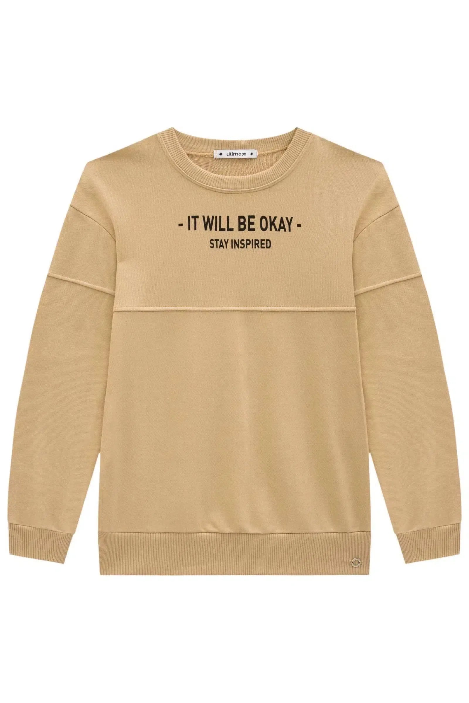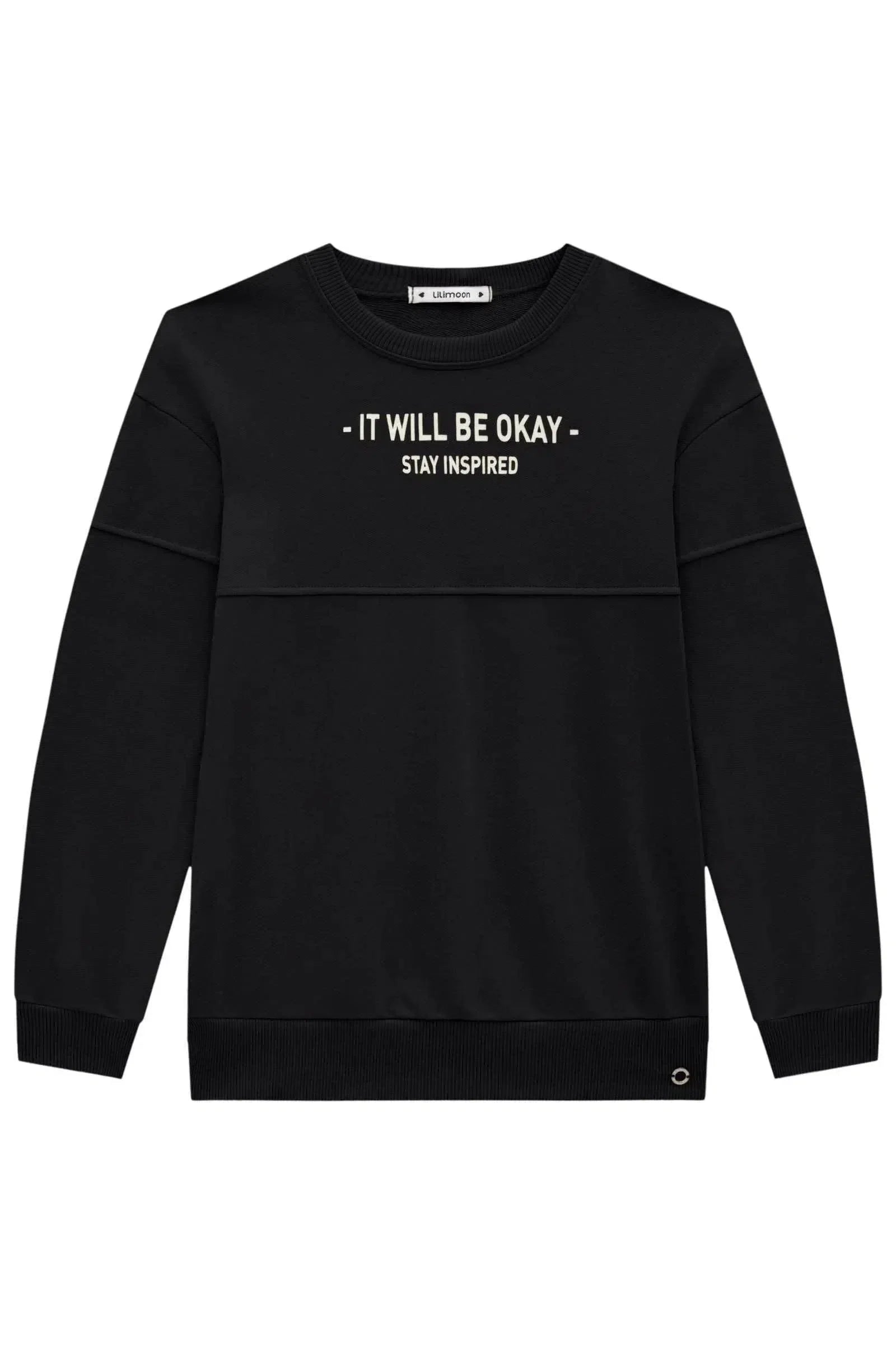 Com um design moderno e a frase "It will be okay - Stay Inspired" (Tudo vai ficar bem - Continue inspirada), essa peça une conforto e estilo com uma mensagem positiva. Confeccionado em moletom de alta qualidade, ele oferece um caimento perfeito e liberdade de movimento. O corte clássico e os detalhes na costura dão um toque moderno e autêntico.