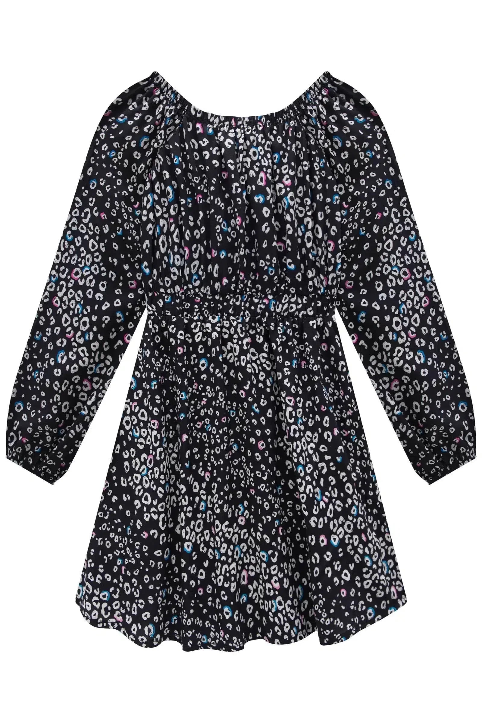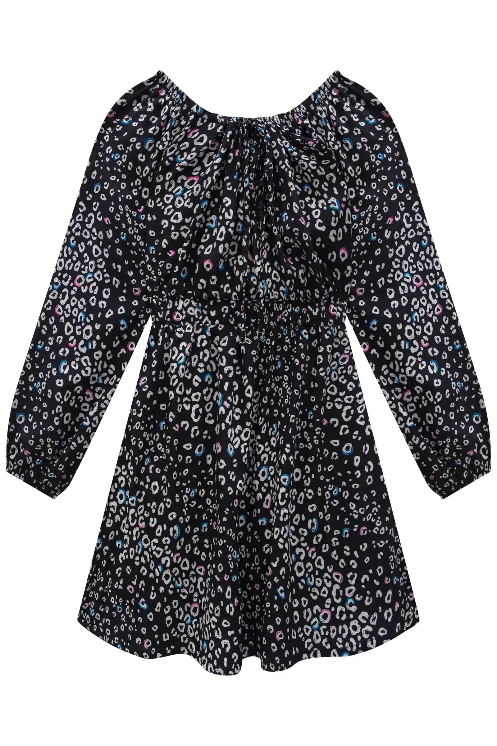 Com modelagem evasê e estampa digital, o vestido confere um ar moderno e despojado ao look. O decote redondo e as mangas longas com punho elástico completam o design, proporcionando conforto e estilo.