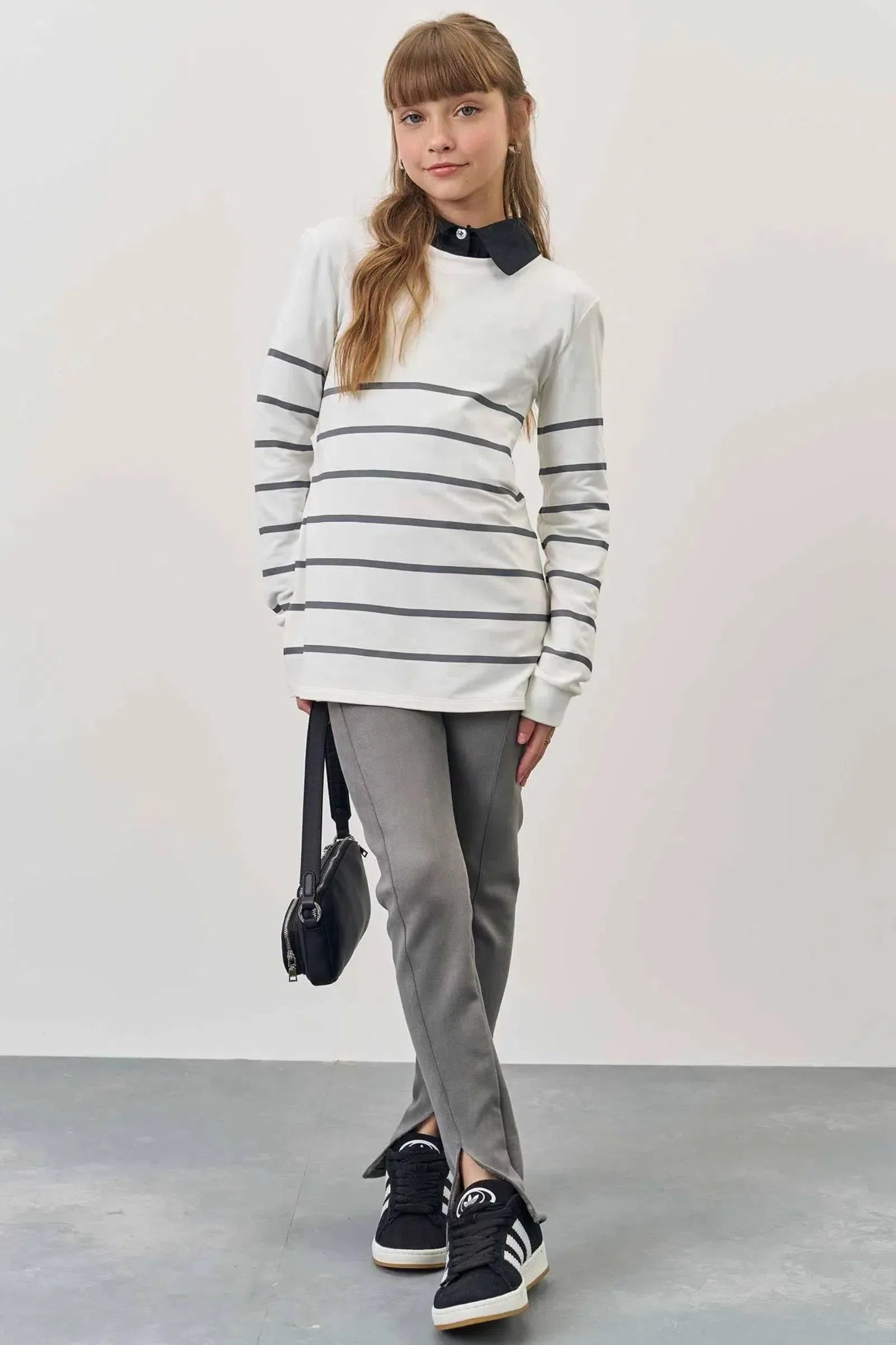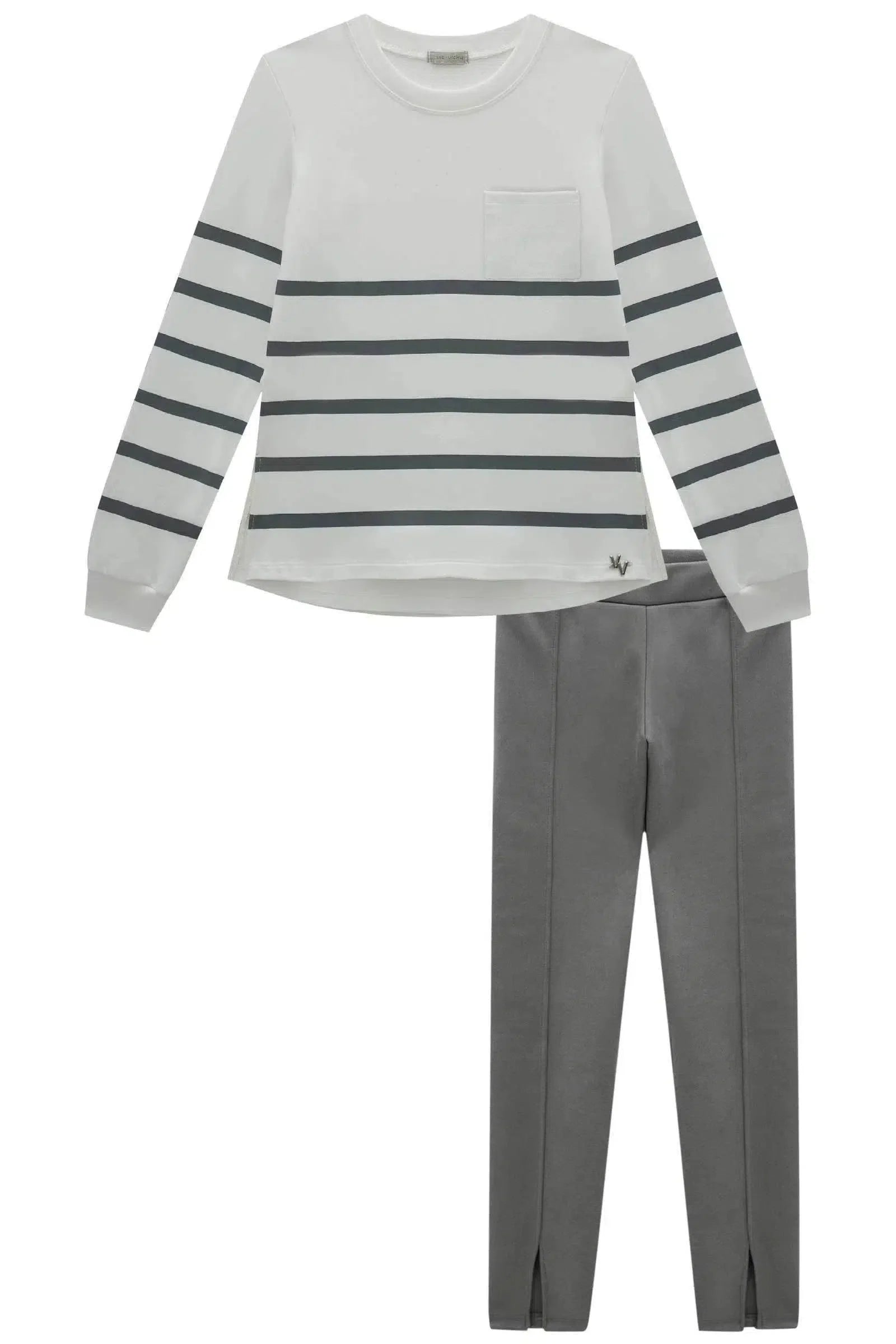 A blusa alongada, com mangas longas e listras horizontais, proporciona um visual moderno e despojado. A legging, com modelagem ajustada ao corpo e cós alto, completa o conjunto com um toque de estilo.