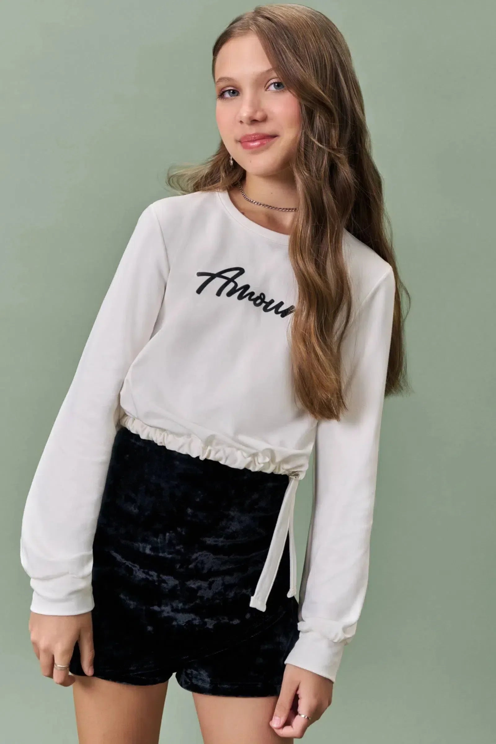 O Conjunto Blusa Boxy em Molevisco e Short Saia em Veludo Royal Vic.Vicky Trends é a escolha perfeita para as adolescentes que buscam conforto e estilo nos dias mais frescos. A blusa em molevisco com amarração na cintura adiciona um toque feminino e delicado à peça, permitindo ajustar o caimento da blusa. A estampa "Amour" traz um toque r delicado à blusa, além de ser super trend. O short saia em veludo royal com transpasse frontal e detalhe de pregas adiciona um toque feminino e elegante a peça.