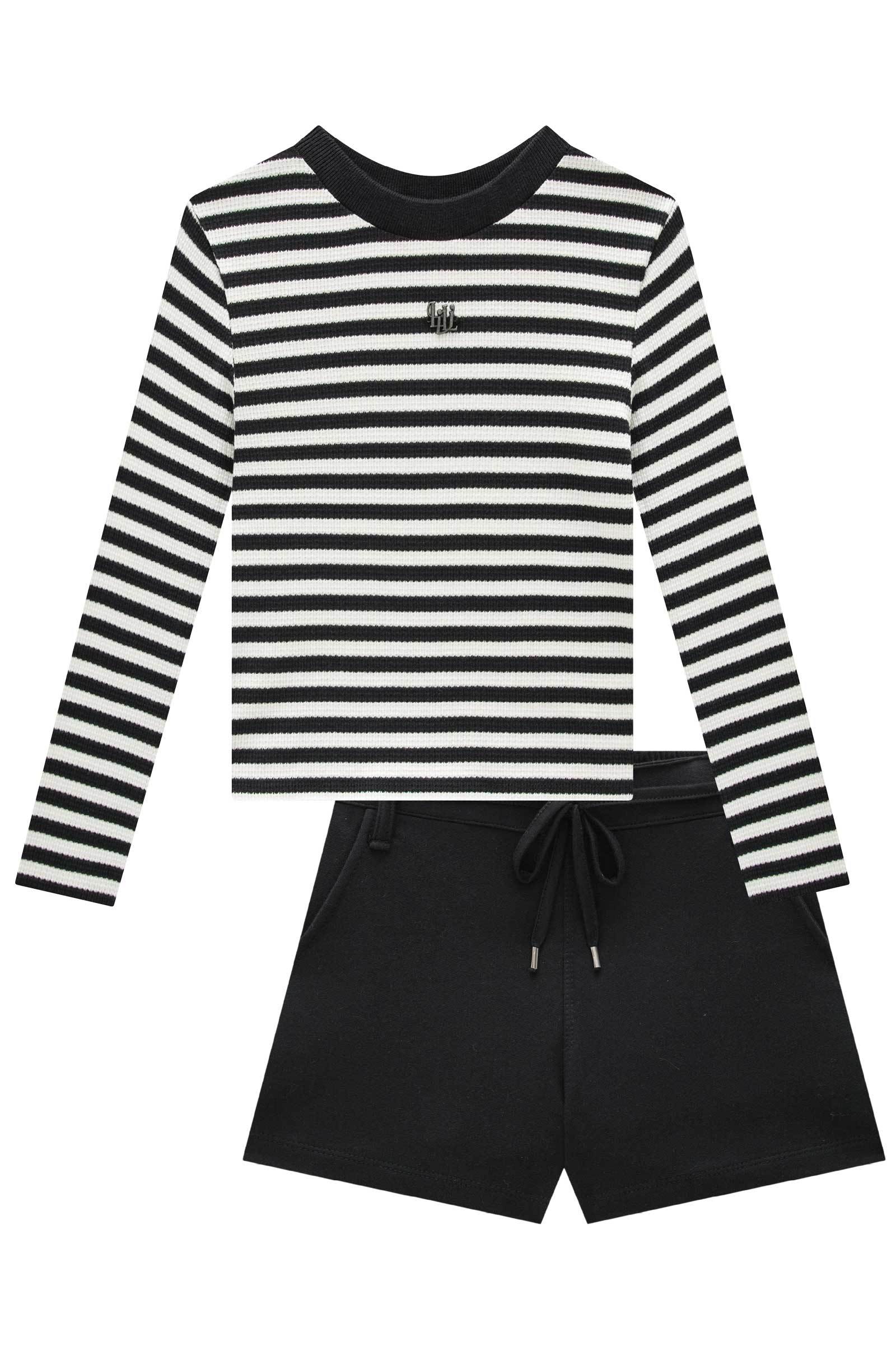 O conjunto de blusa em malha waffle listrada e shorts em moletom sem pelúcia, é a escolha perfeita para as meninas que amam um look cheio de conforto, sem abrir mão do estilo no dia à dia! Disponível em uma cor super estilosa - preto - ela é uma peça essencial, perfeita para montar diversos looks e deixar o inverno das pequenas ainda mais estiloso!
