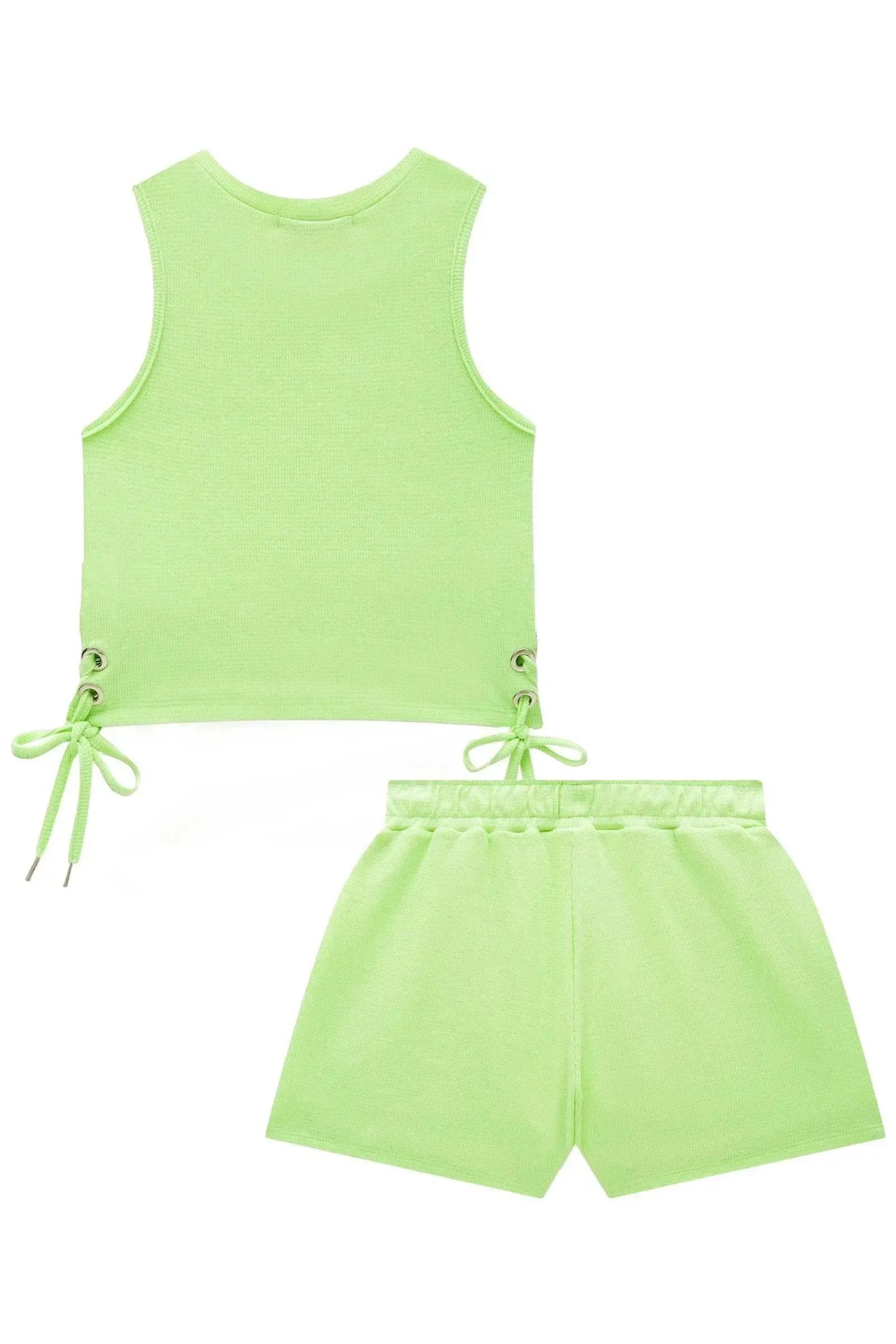 O conjunto de blusa boxy e shorts em malha little waffle, é perfeito para as meninas que amam um look cheio de estilo e personalidade! disponível em uma cor super estilosa - verde - ele oferece um toque super macio e confortável, ideal para o dia a dia e para manter a pele fresquinha.