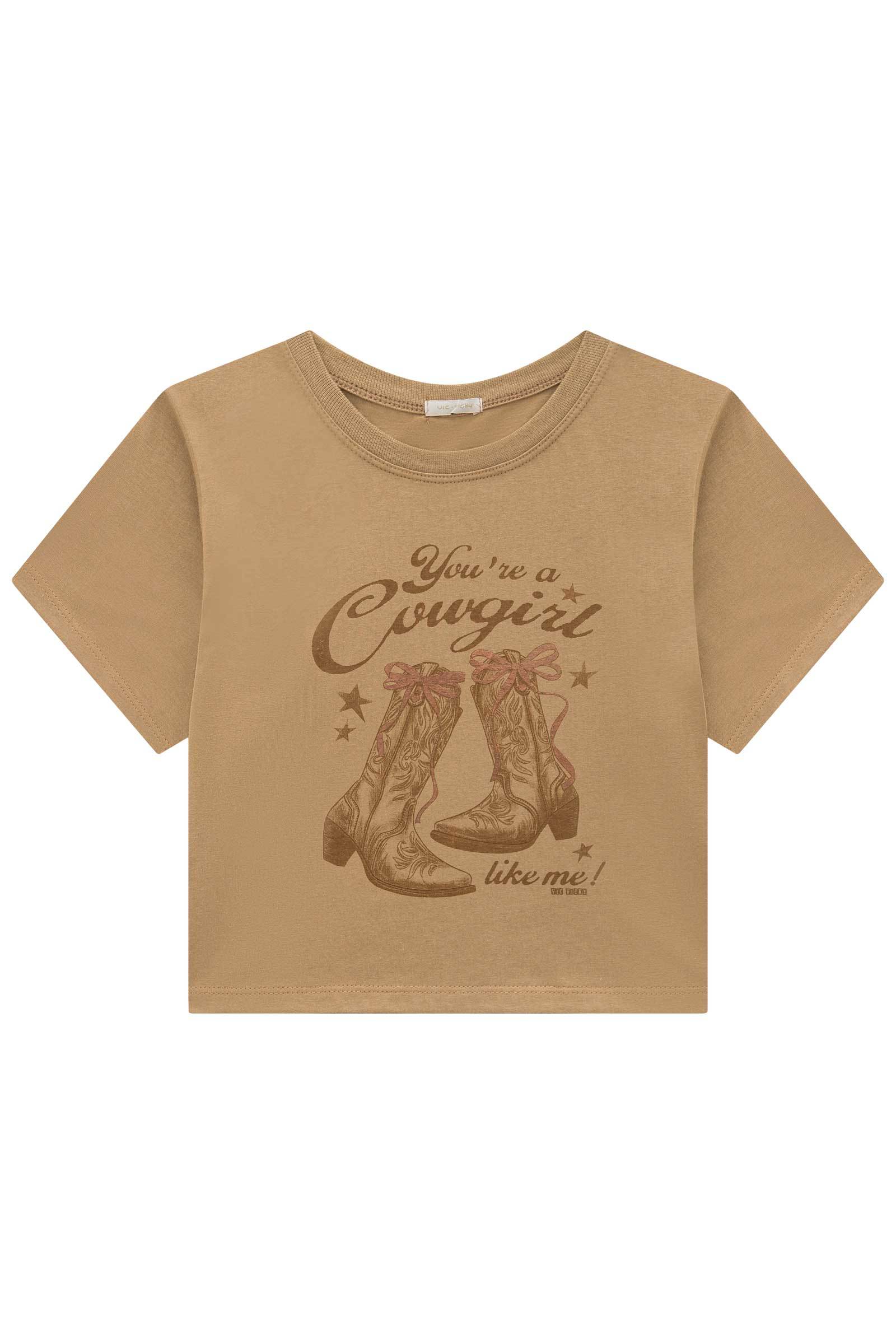 O destaque da peça é a estampa em foil com ilustração de botas western e detalhes brilhantes que deixam o look ainda mais divertido.
