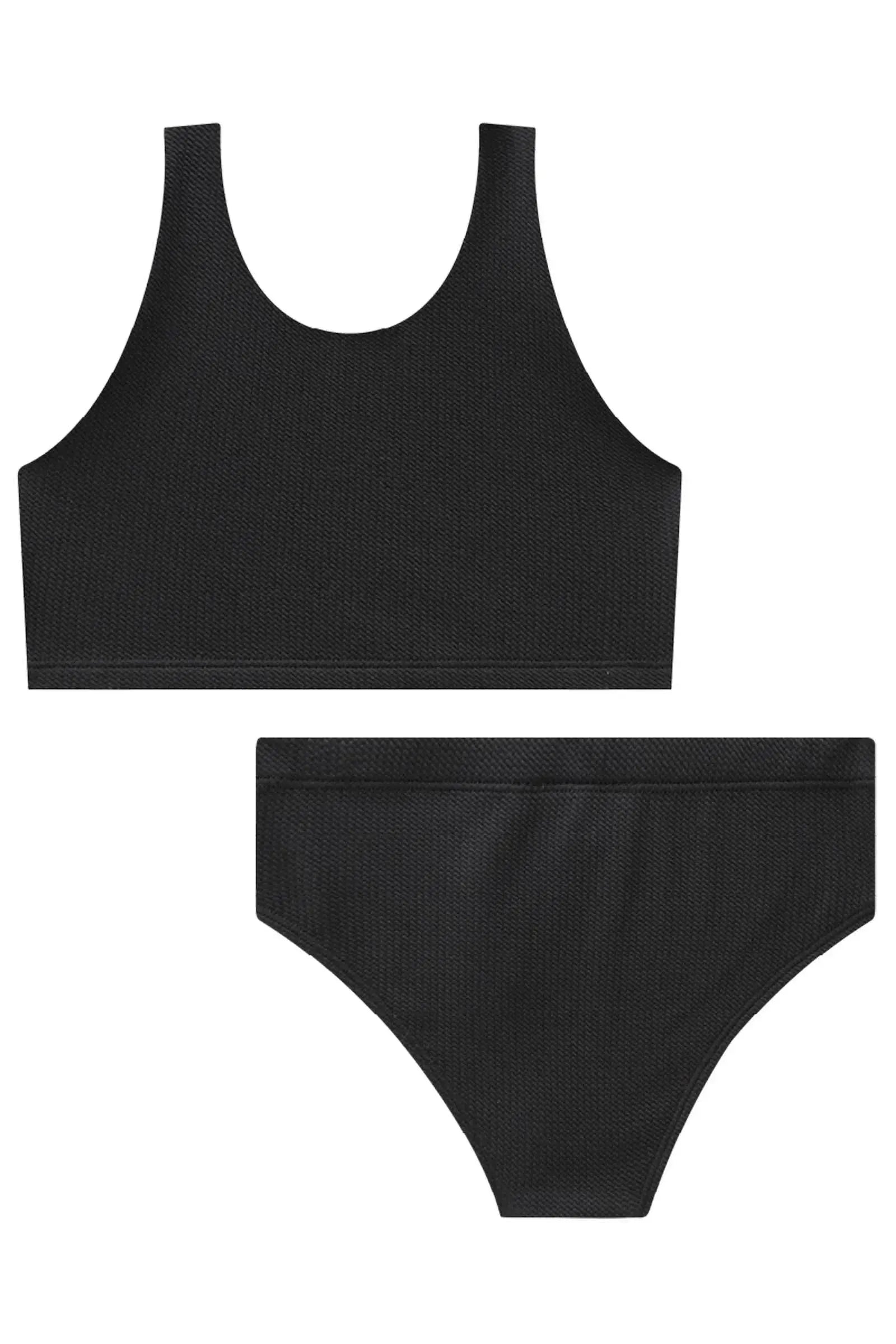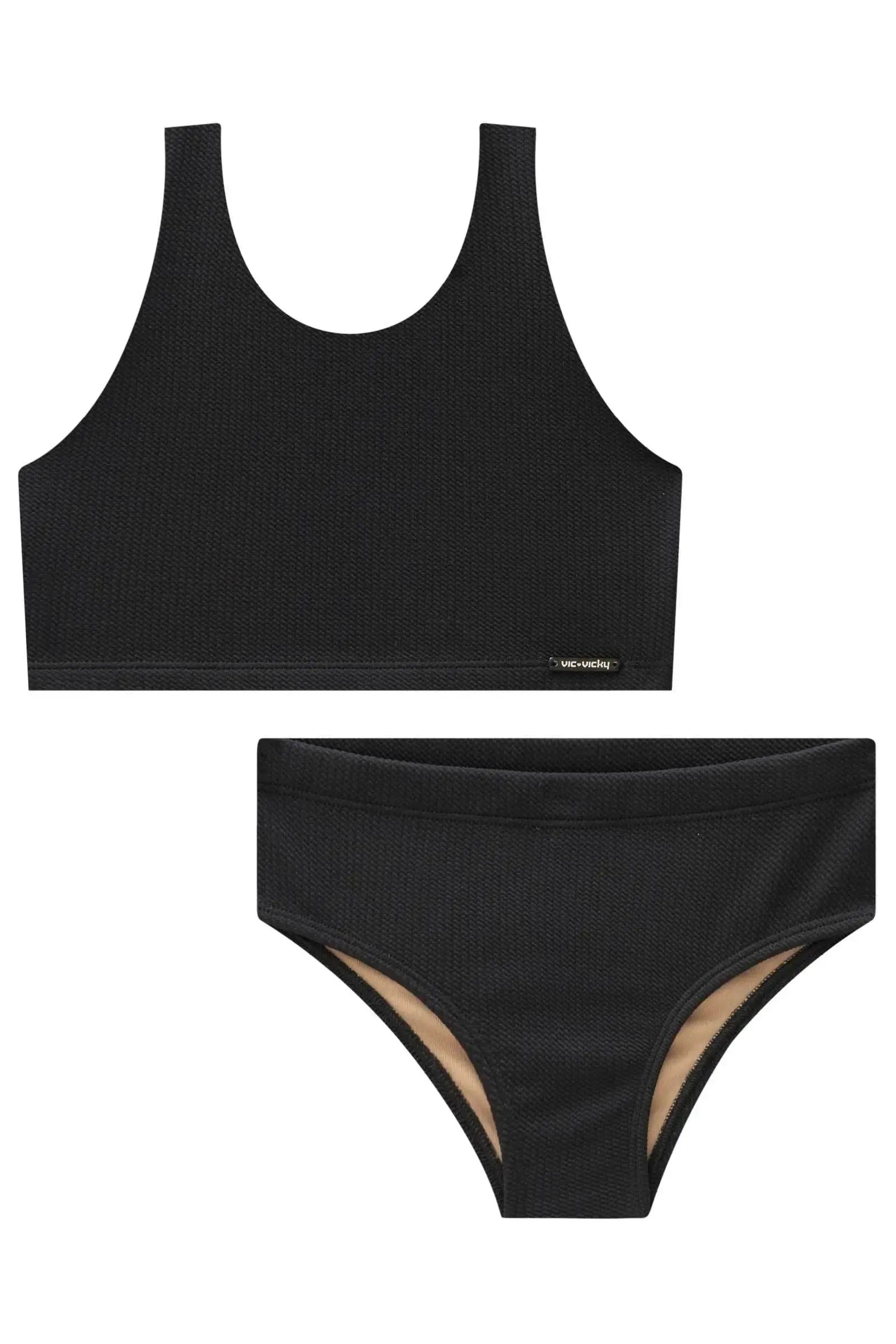 O conjunto de biquíni em malha jacquard catarina UV50+ é perfeito para as meninas que amam um look cheio de estilo e conforto para aproveitar muito o verão! Disponível em duas cores super estilosas - verde e preto - ele oferece um toque super macio e confortável, garantindo proteção para a pele das meninas.