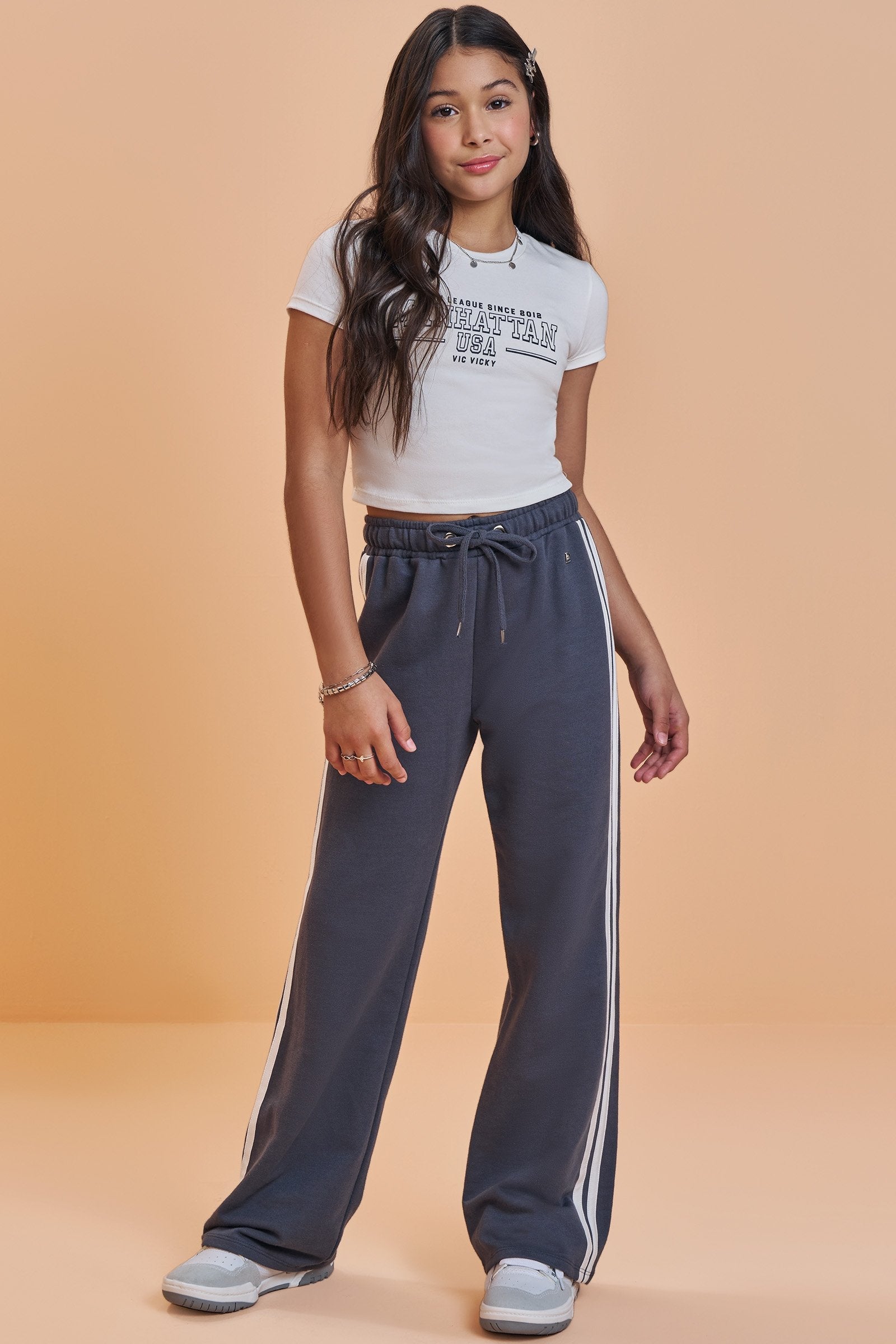 Composto por blusa cropped em cotton off-white e calça wide leg em moletom sem pelúcia, o look traduz a essência urbana e descolada das meninas que amam estar na moda.