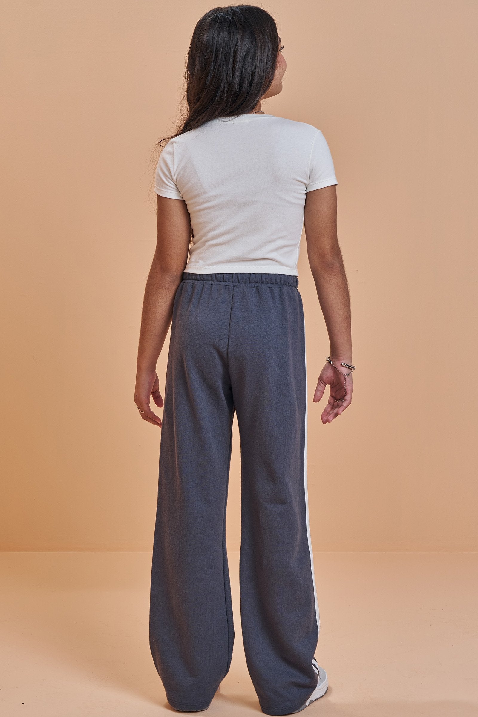 A calça, em tom grafite, traz modelagem wide leg, listras laterais e cordão ajustável com ponteiras metálicas, unindo praticidade e estilo em um visual superatual.