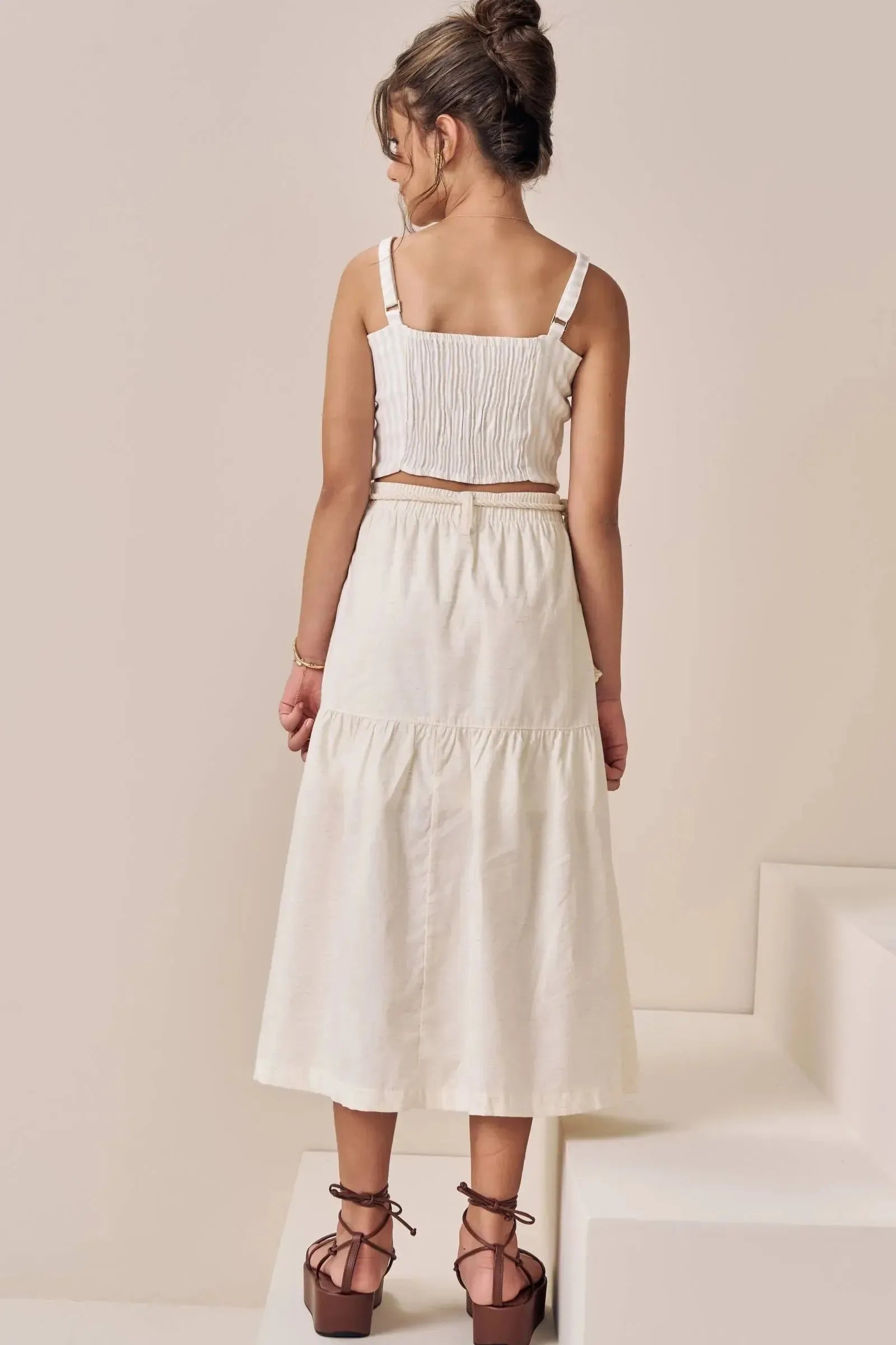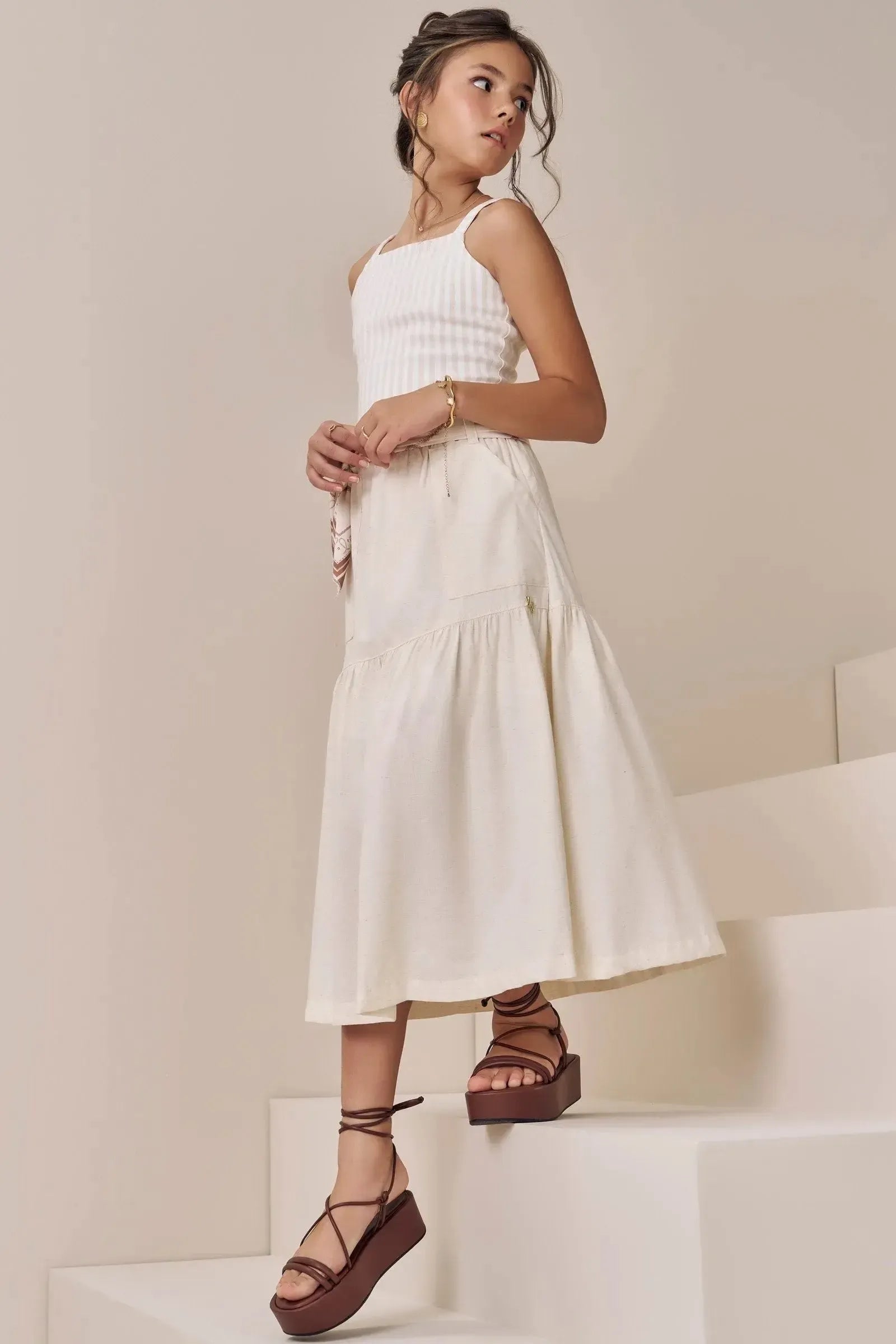 O conjunto de blusa cropped em linho fio tinto e saia new midi em linho delux, é perfeito para as meninas que amam um look cheio de estilo e personalidade! Disponível em uma cor super estilosas - bege - ele oferece um toque super macio e confortável, ideal para o dia a dia e diversas ocasiões.