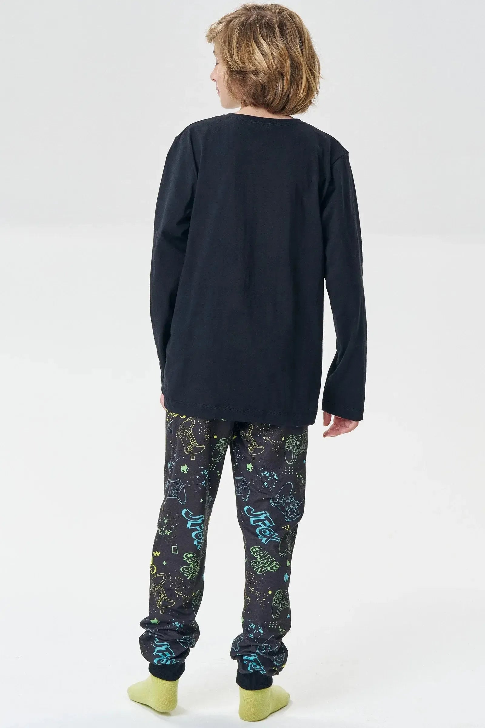 O conjunto de pijama de camiseta em meia malha e calça jogger em malha comfy, é a escolha perfeita para os meninos que amam um look cheio de conforto, sem abrir mão do estilo no dia à dia! Disponível em uma cor super estilosa - preto - ela é uma peça essencial, perfeita para montar diversos looks e deixar o inverno dos pequenos ainda mais estiloso! A estampa divertida, adiciona um charme especial à peça.