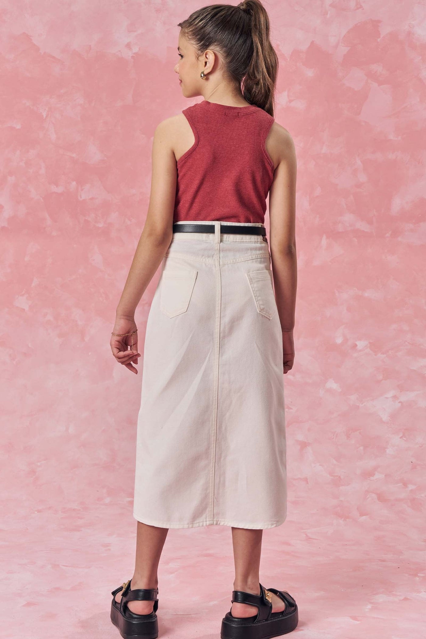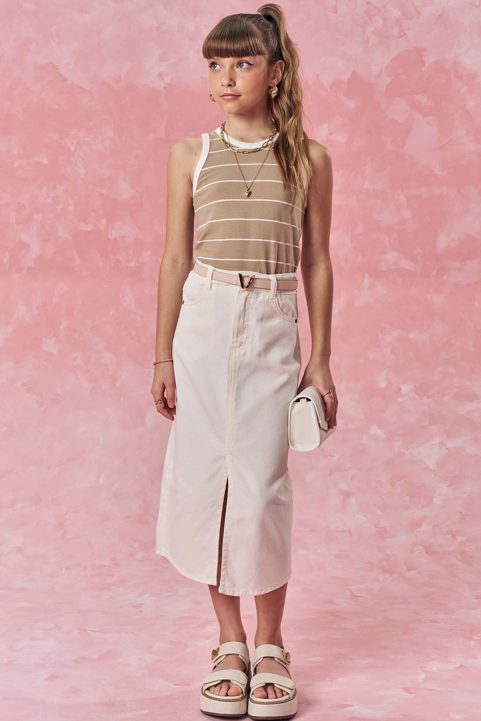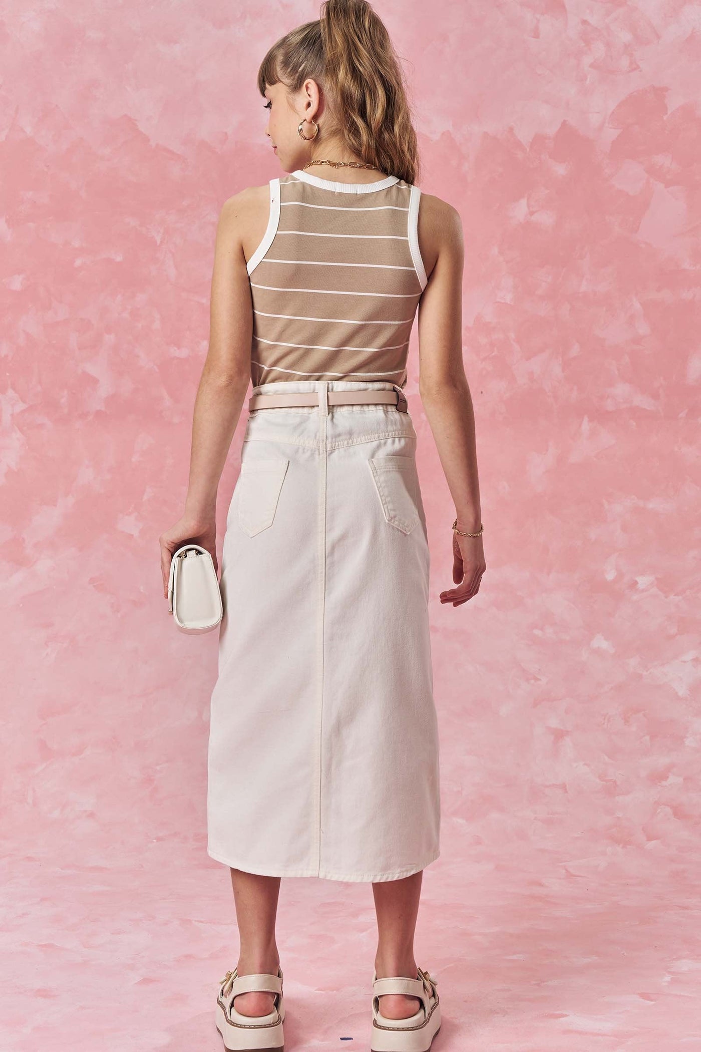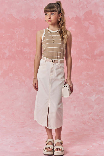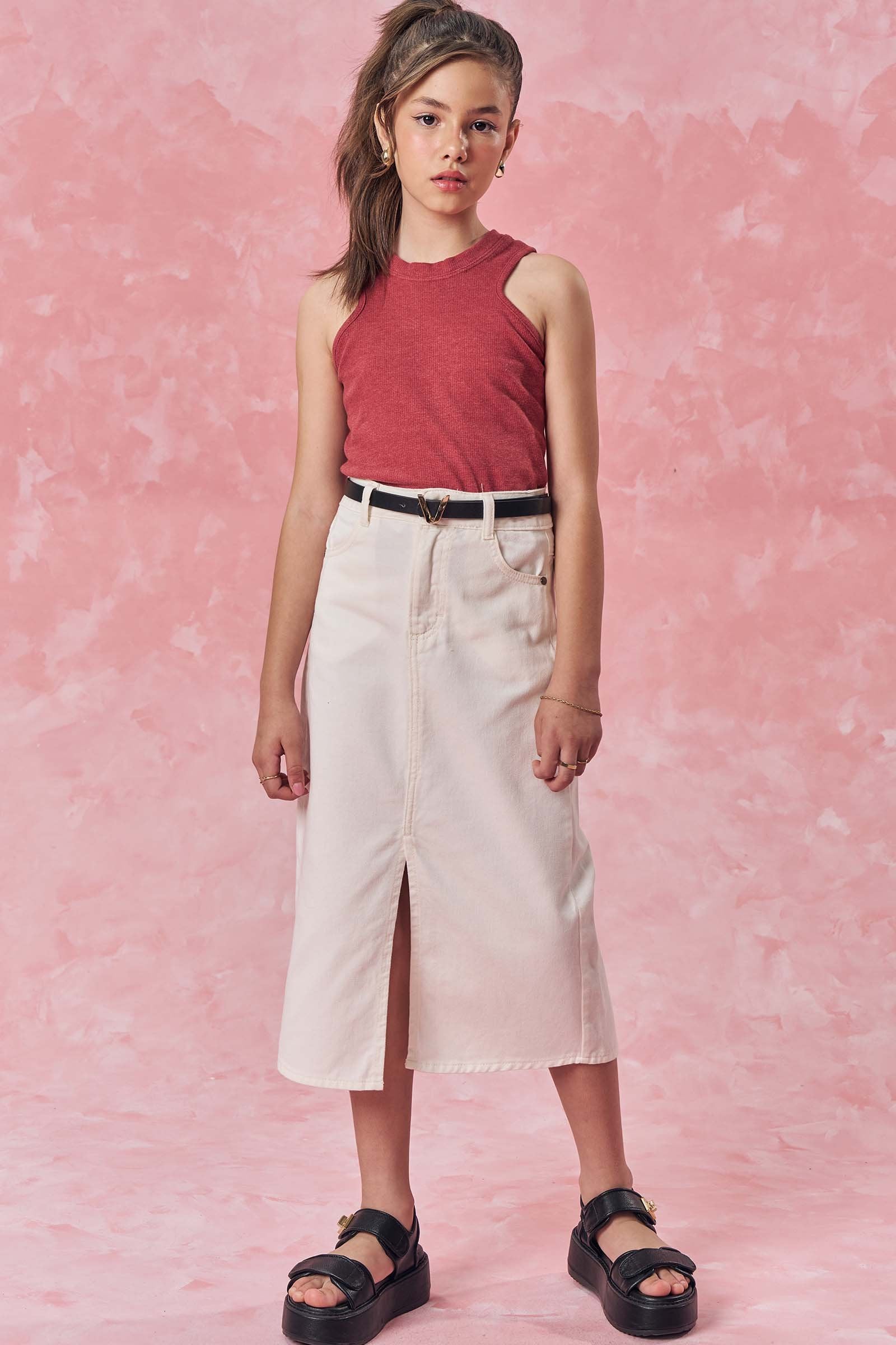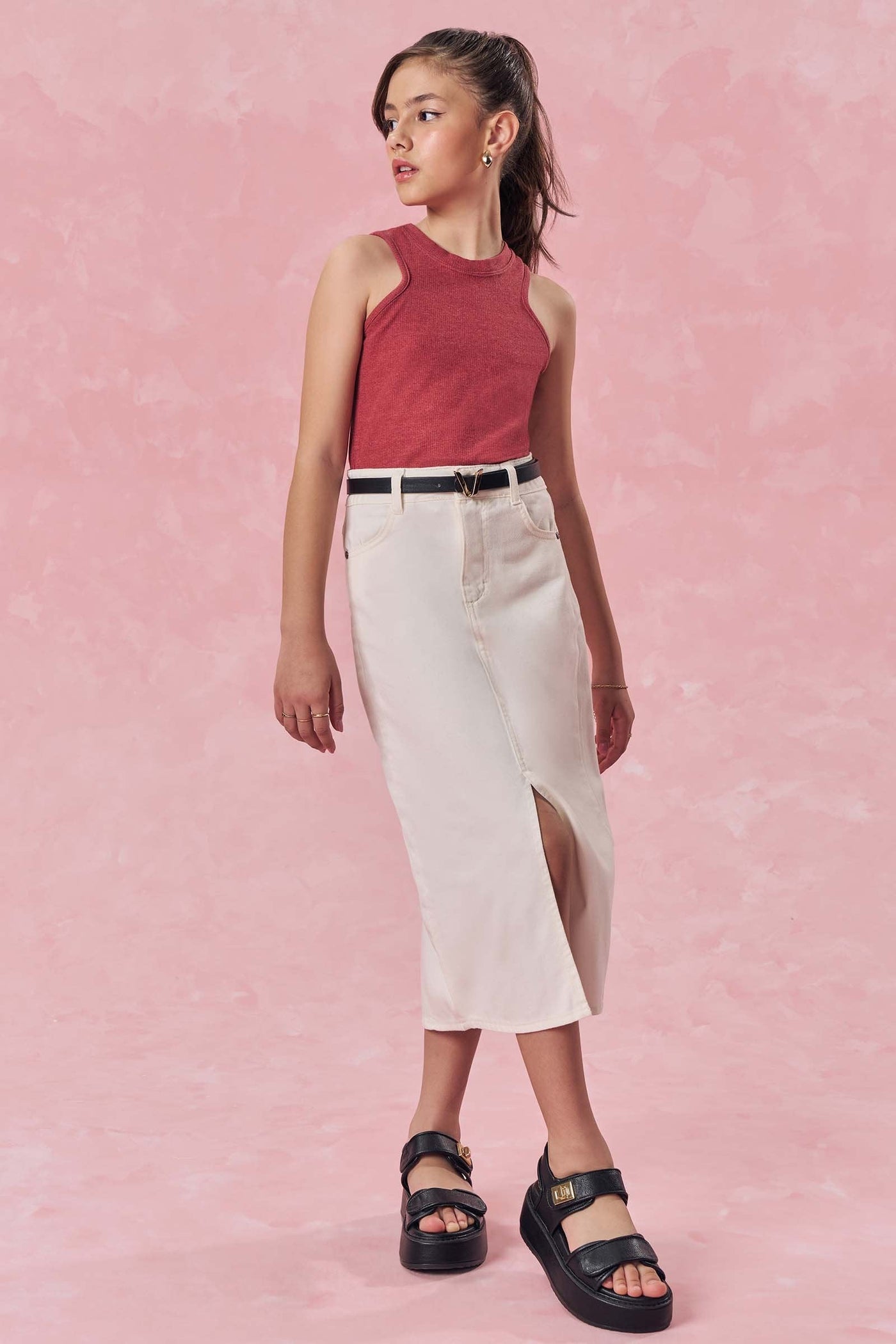 A saia midi em sarja com elastano é uma peça extremamente confortável e versátil, perfeita para diversas ocasiões. Disponível em uma cor super clean e estilosa - off white - ideal para criar looks práticos e estilosos, proporcionando muito estilo e conforto.